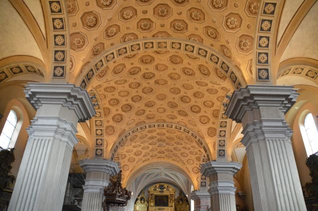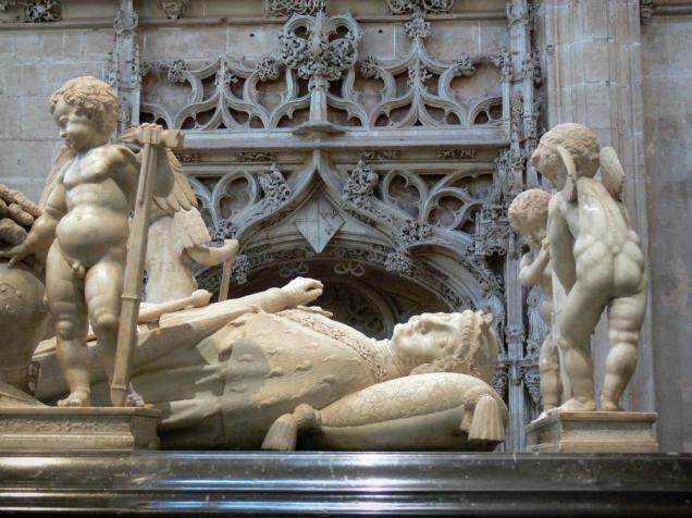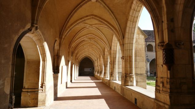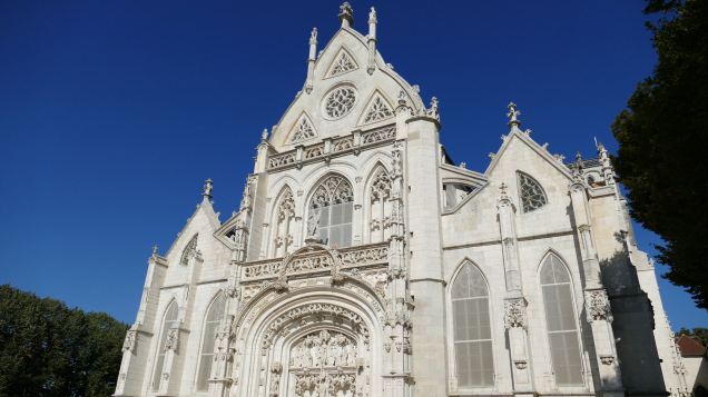 Julie nous attend devant le portail majestueux de l’église et nous la suivons à l’intérieur. Tout d’abord, elle nous raconte la vie de Marguerite d’Autriche, indispensable pour mieux appréhender notre visite. Elle nous invite à la suivre, tout d’abord dans les cloitres : le 1er, le plus petit est dédié à l’accueil, le second à la prière et à la méditation, le troisième cloître est celui des communs pour la vie quotidienne des moines augustins. Nous entrons enfin dans la somptueuse église Saint-Nicolas-de-Tolentin édifiée de 1513 à 1532, surmontée d’un toit de tuiles vernissées polychromes. La nef est claire, blanche en pierre calcaire de Revermont. Les vitraux sont incolores d’origine. Elle est volontairement sobre pour contraster avec la richesse et l’exubérance du chœur. Aucune messe n’a jamais été célébrée dans l’église.
