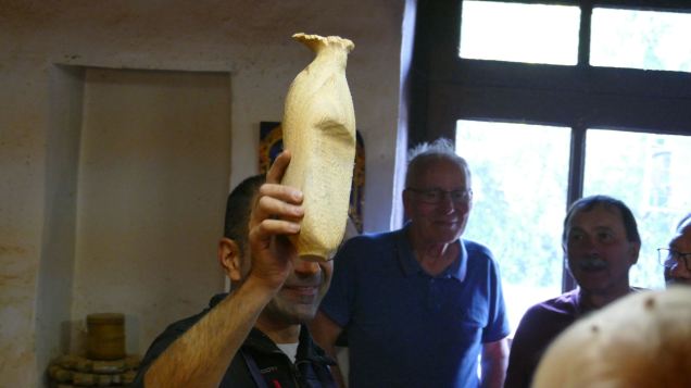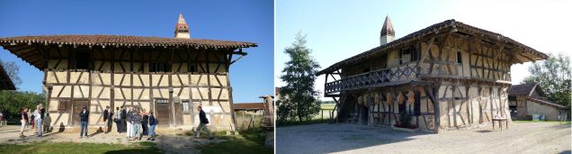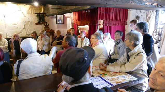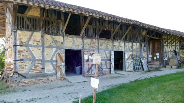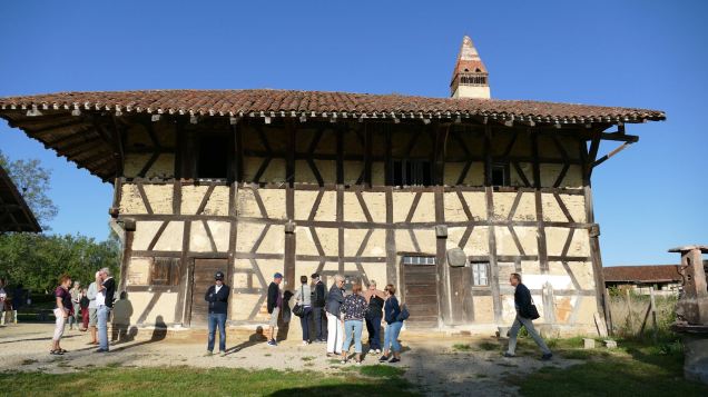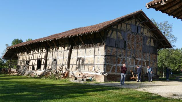 Nous sommes accueillis par Eric qui nous donne maintes explications sur cette ferme bressane authentique à colombages construite à la fin du 16è siècle, inscrite au titre des monuments historiques en 1930. La technique de construction est typique de la Bresse : des  poutres posées à même le sol (faute de pierres dans cette partie de la Bresse), une structure en bois (colombages), des tressages de bois (noisetier, frêne…) et un remplissage en torchis (terre crue).