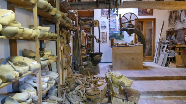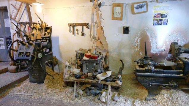 Tout d’abord l’ébauche (en bois vert) du sabot est découpée à la scie, elle passe ensuite sur une machine qui permet à l’aide d’un seul modèle de tourner l’extérieur puis de creuser l’intérieur du sabot à l’aide d’une « cuillère ». Les finitions se font sur l’établi appelé « la chèvre » à l’aide d’outils d’époque : le boutoir, les cuillères, la rouanne aussi appelée langue de belle mère et le couteau à parer. Les sabots doivent sécher pendant 4 à 6 mois, ils vont rétrécir en largeur et en épaisseur mais la longueur restera identique. Il faut environ ¾ d’heures pour confectionner un sabot.