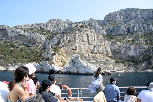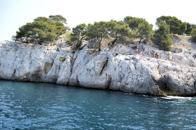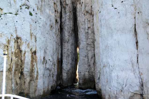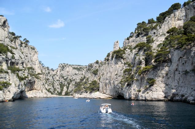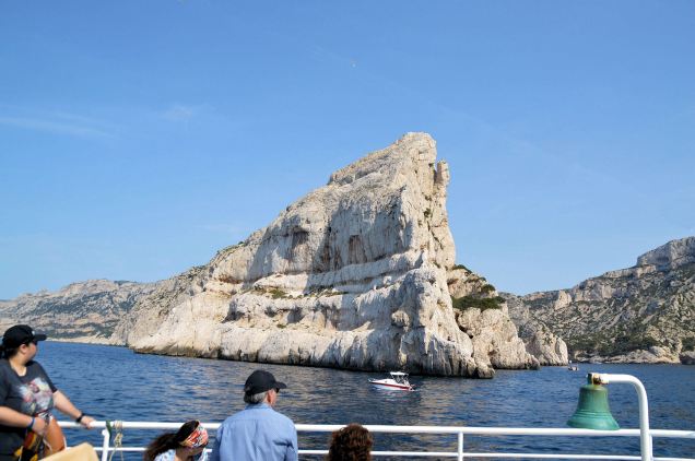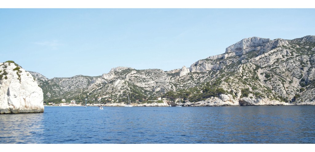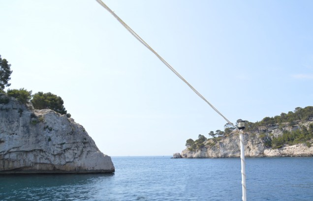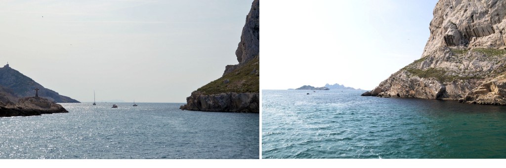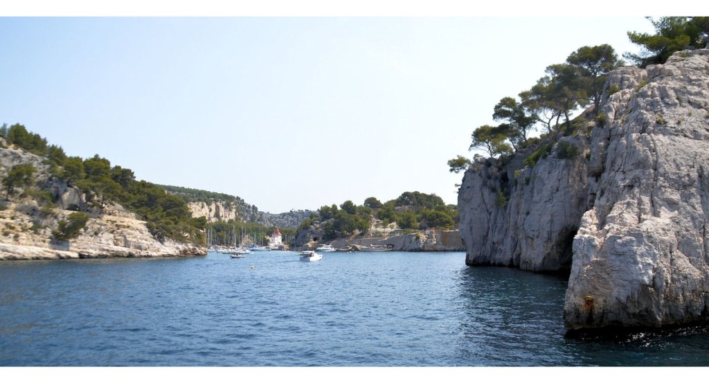 La Calanque d’En Vau considérée comme l’une des plus belles, mise en lumière dans une nature sauvage, est caractérisée par son encaissement et ses murailles de falaises, avec une belle plage de galets. Le contraste de la couleur blanc-gris des falaises qui tombent dans les eaux turquoises est tout à fait sublime. C’est à proximité de ce décor que le bateau a effectué une manœuvre, afin de se positionner au plus près des rochers.