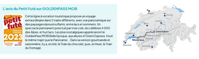 *Le GoldenPass Panoramic propose également un voyage entre Montreux, Gstaad et Interlaken (voir le commentaire du Petit Futé et le lien hypertexte de My Switzerland).