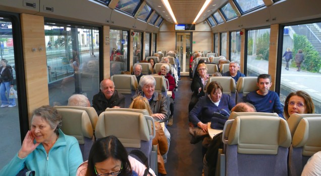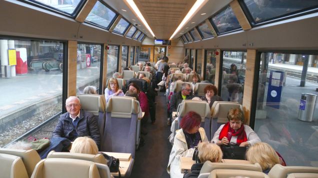 Au terme d’un voyage un peu trop matinal, mais agrémenté par la présence de notre charmante accompagnatrice Charlotte, nous arrivons à la gare de Montreux afin de prendre place à bord du célèbre train GoldenPass Panoramic*.