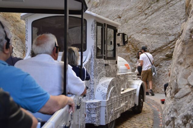 Une fois installés à l’intérieur des wagonnets et équipés d’un audioguide destiné à chaque voyageur, nous avons entrepris la ballade, qui nous a conduit vers les endroits les plus intéressants de la cité ; depuis le Palais des Papes, jusqu’aux rues sinueuses de la vieille ville et au célèbre pont d’Avignon. En quarante cinq minutes, on découvre les principaux lieux emblématiques, dont certains passages délicats, habillement négociés par le chauffeur !