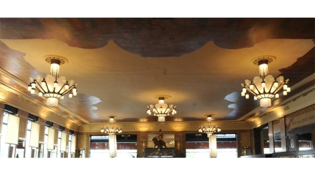 Devant nous une salle immense avec un plafond peint dans un style art-déco par Bruno Guillermin, des banquettes rouges, de belles nappes blanches sur les tables.