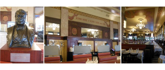 Au-dessus d’une grande glace murale est inscrite la fameuse devise de la Maison : « BONNE BIÈRE ET BONNE CHÈRE DEPUIS 1836 »