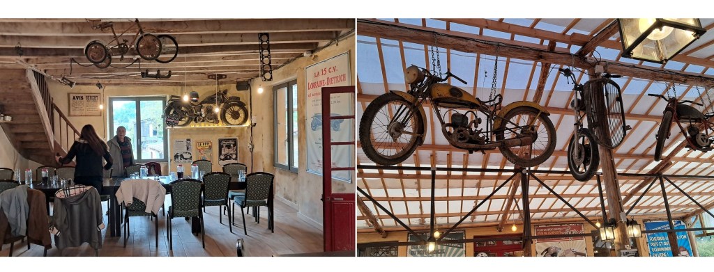 Le car nous dépose directement au restaurant Le Paddock 135, une guinguette familiale style des années 30, avec pour thème la mécanique. Il est recommandé par la plateforme de recherche de restaurant Restaurant Guru, pour sa cuisine périgourdine simple et authentique, ainsi que son ambiance chaleureuse. A n’en pas douter, cette réputation se confirme par l’accueil qui nous est réservé. Le menu, composé de plats maison, conforme à la notoriété de ce restaurant, semble avoir été unanimement apprécié, ainsi que le service prompt et attentif.