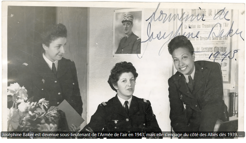 Joséphine Baker est également une résistante de la Seconde Guerre mondiale. Devenue française par son mariage, en 1937, avec Jean Lion, un industriel de confession juive, elle décide d’entrer en résistance contre les nazis et refusera de chanter à Paris tant que les Allemands y seront. Après avoir combattu l’occupation allemande, Joséphine Baker est officiellement engagée, en mai 1944, pour la durée de la guerre à Alger dans l’armée de l’air et devient sous-lieutenant.