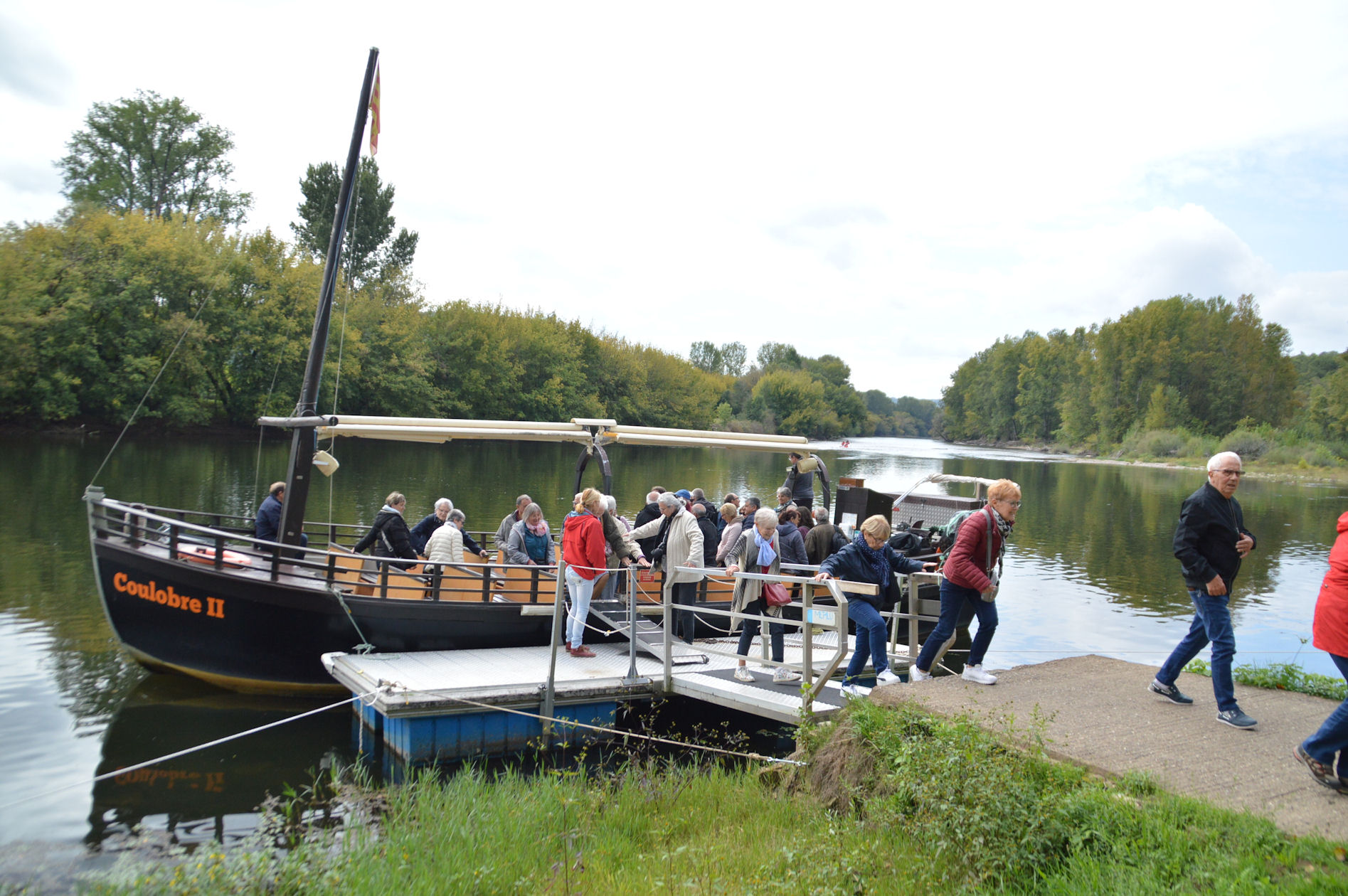 Tous les passagers étant embarqués à bord, le bateau s’élance sans bruit et au fur et à mesure qu’il s’éloigne du quai, les ondulations de l’eau, ainsi que le léger craquement de sa coque, évoquent l’épopée des pionniers de la batellerie au 19ème siècle, qui transportaient leur cargaison sur la Dordogne.