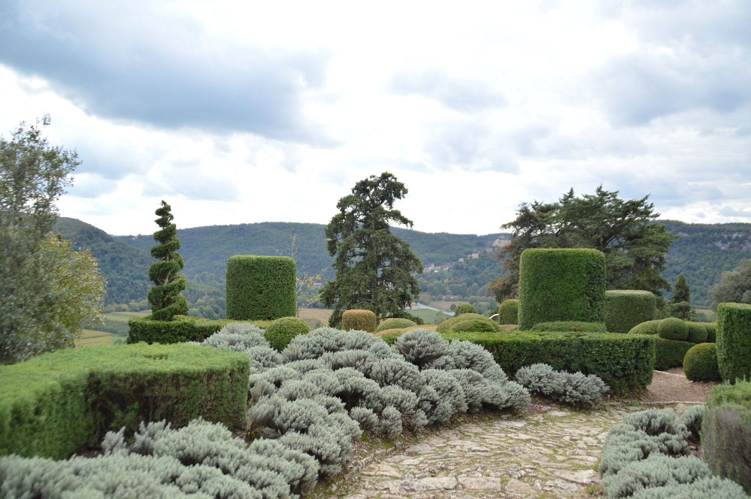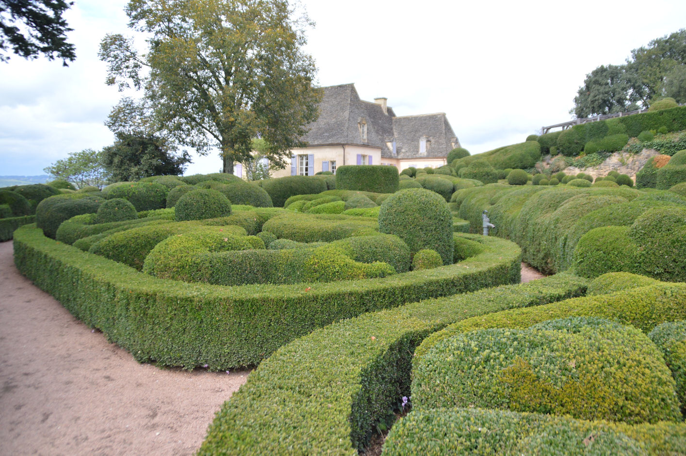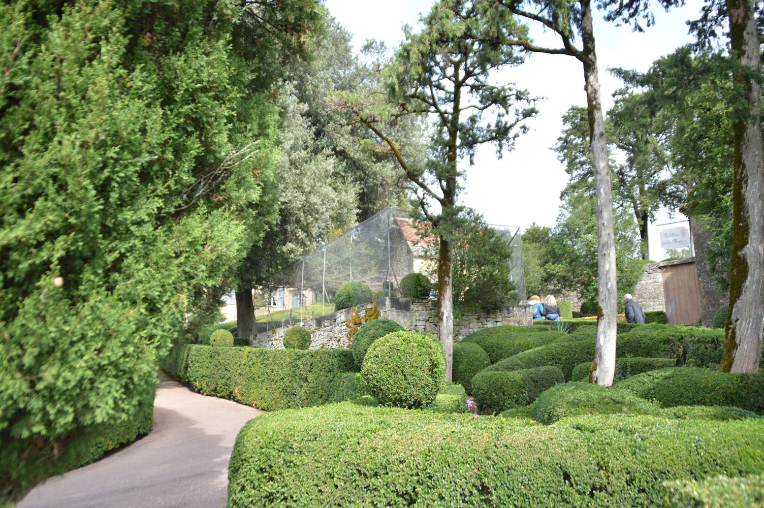 Nichés sur un promontoire, ces jardins à la française disposent d’une vue imprenable sur la vallée de la Dordogne et d’un peu plus de six kilomètres de promenades ombragées, bordées de 150 000 buis centenaires taillés à la main, agrémentés de belvédères, rocailles et parcours d’eau… Les jardins ont été réhabilité en 1996, une restauration qui s’est attachée à la préservation des lieux, afin de redonner au parc son caractère d’antan, principalement l’allée serpentine de santolines et de romarins, ainsi que dans l’esprit des rocailles du 19ème siècle.