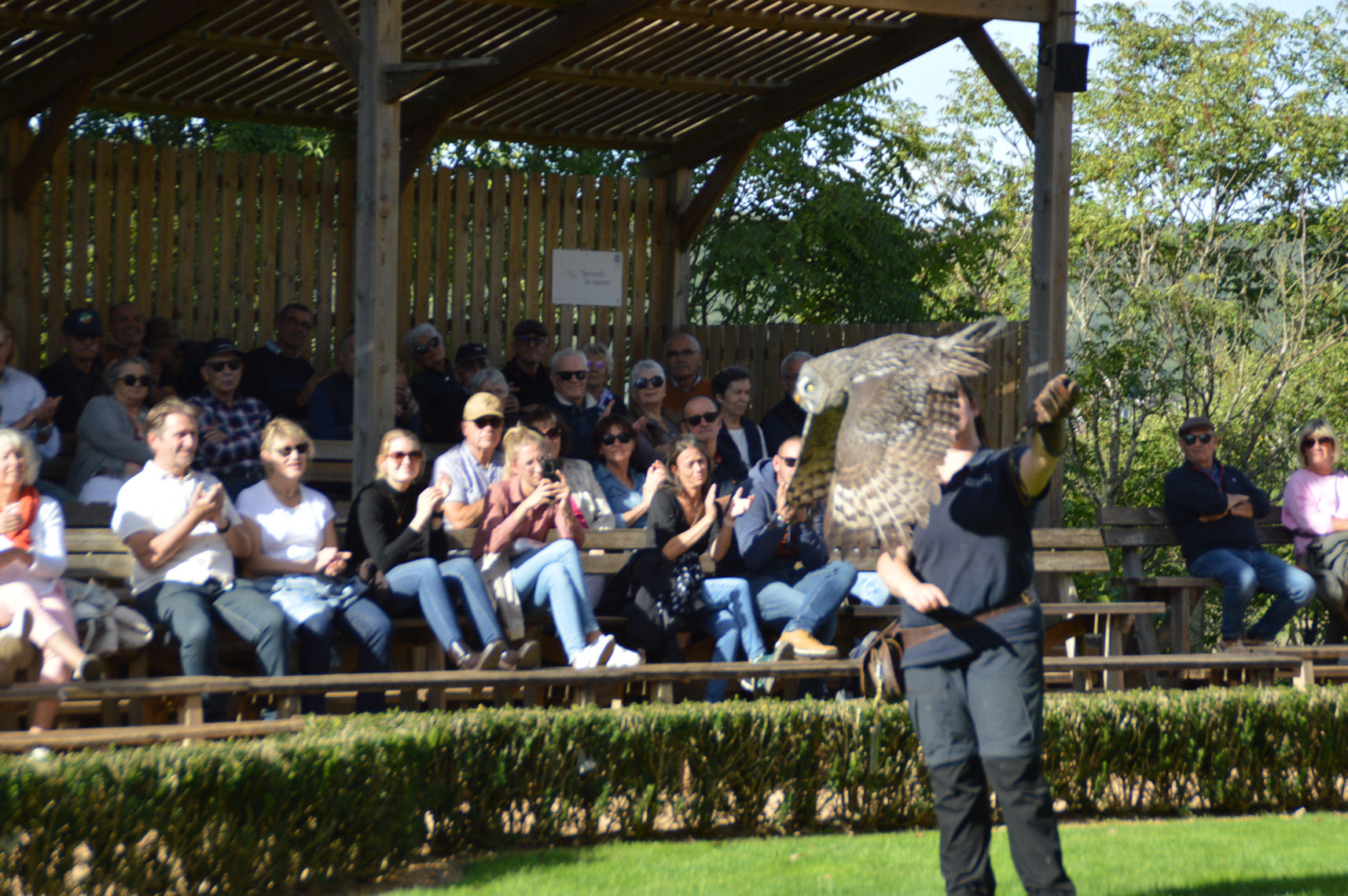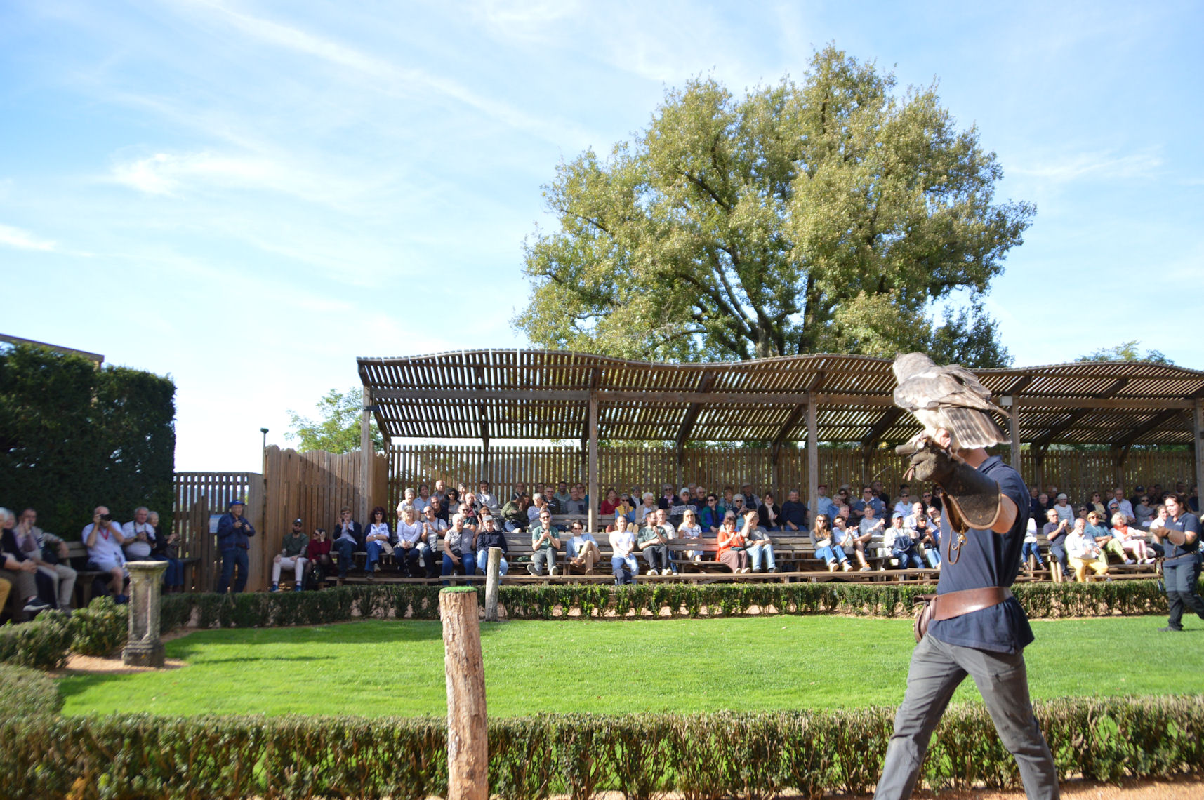 Après la visite du château, nous assistons à un spectacle de rapaces présentant des faucons, aigles et buses, qui évoluent majestueusement devant nous. Ils sont guidés par des fauconniers visiblement à l’aise et heureux de partager leur savoir et leur amour pour ces oiseaux fascinants.