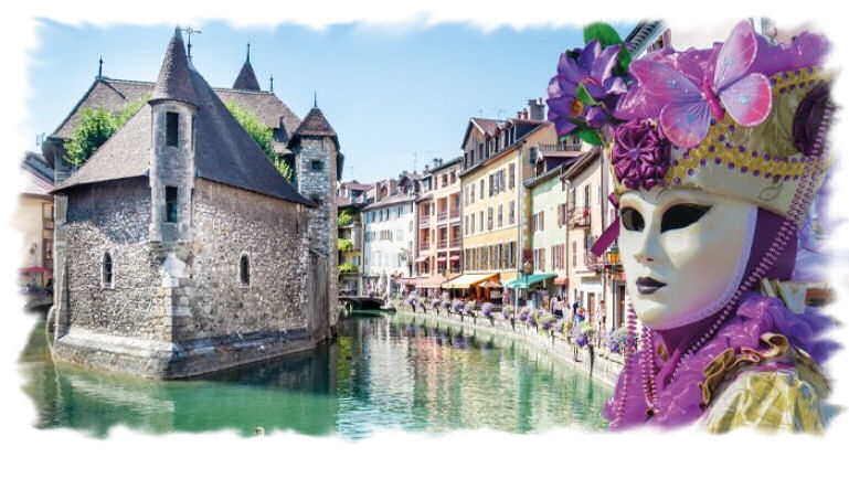 Chaque année, à la fin du mois de février, celle qui est surnommée la « Venise des Alpes », organise à l’instar de la Sérénissime Venise, un carnaval le long des canaux et dans les ruelles de la vieille ville d’Annecy. Un ballet de près de 350 masques et costumes qui prennent la pose et déambulent lentement dans le silence, ponctué de jeux de jonglage et autres animations. Les silhouettes richement ornées, mises en valeur par les ocres des bâtiments anciens du vieil Annecy, sont plongées dans une atmosphère de silence, de mystère et de raffinement propre au carnaval vénitien.